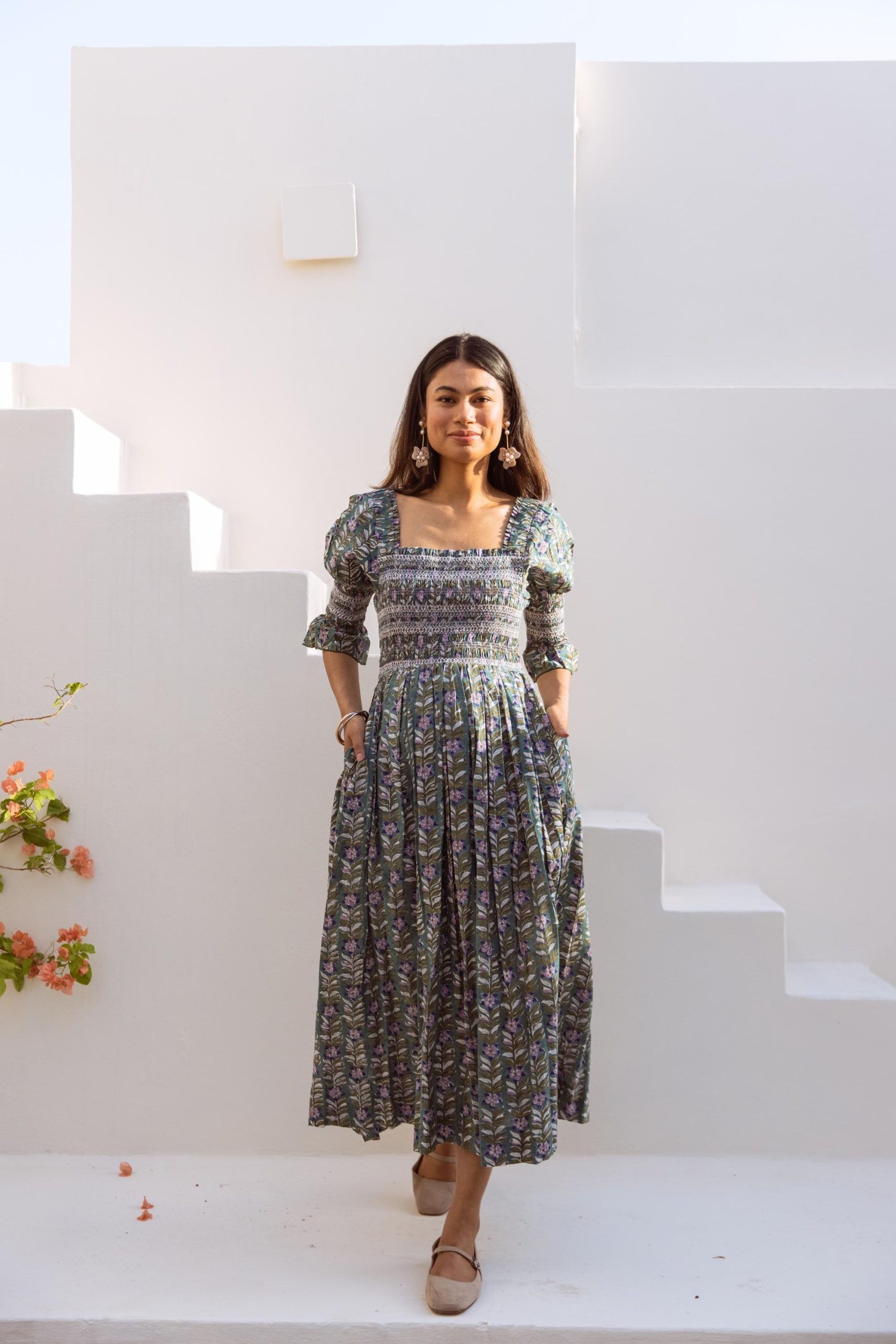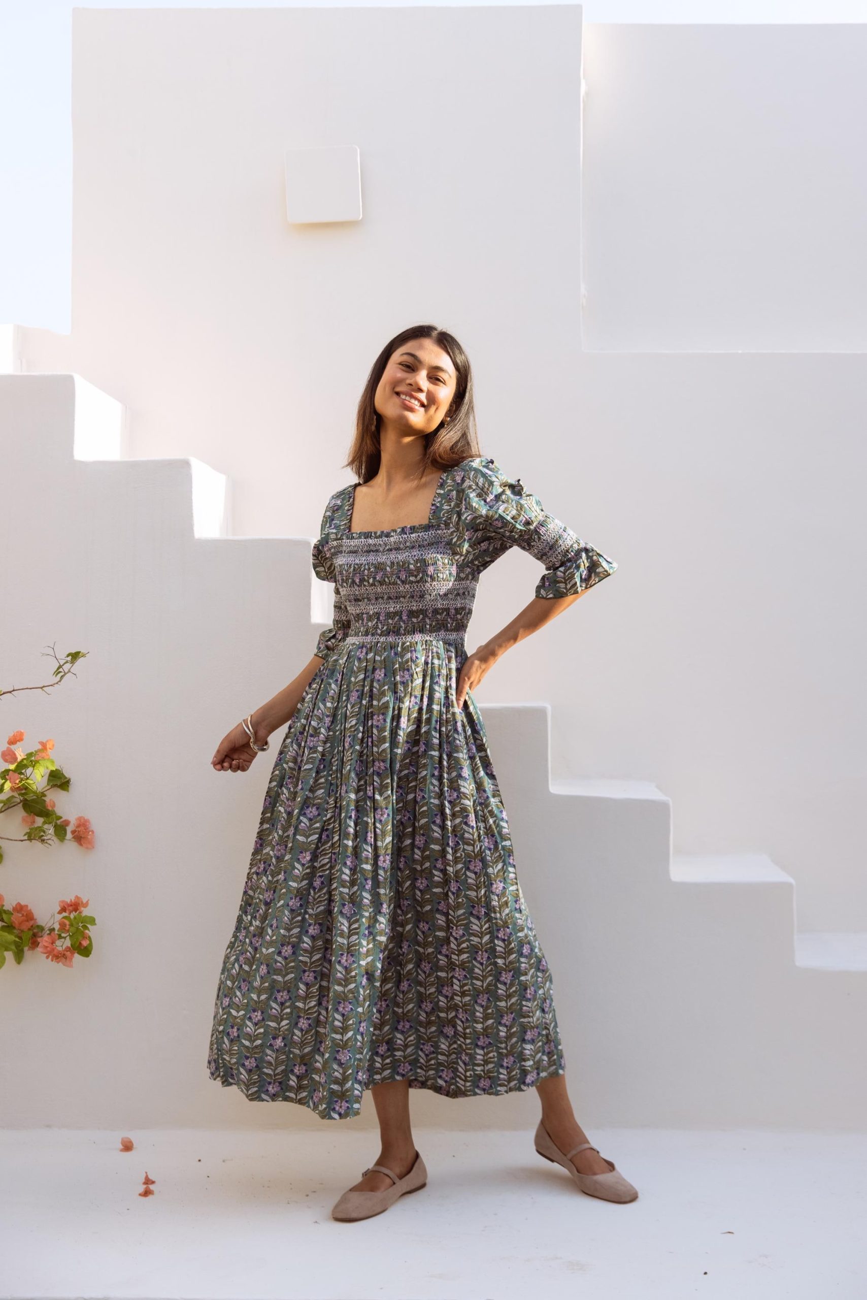 Crafted from breathable cotton and hand block-printed in vibrant, feel-good colors, this one’s made to brighten your day. The body features colorful smocking that hugs just right, while puff sleeves with matching smocked details add a fun, flirty touch. A square neckline keeps it sweet and structured, and yes—it has pockets.